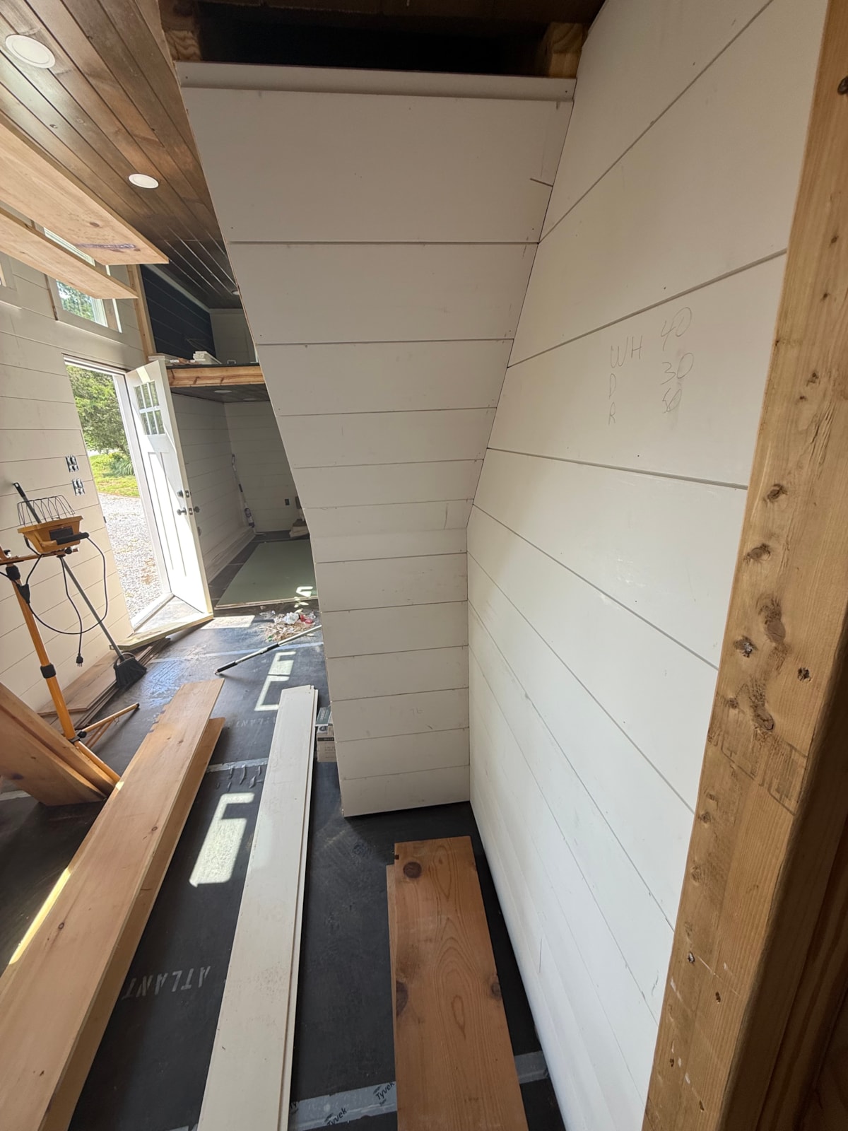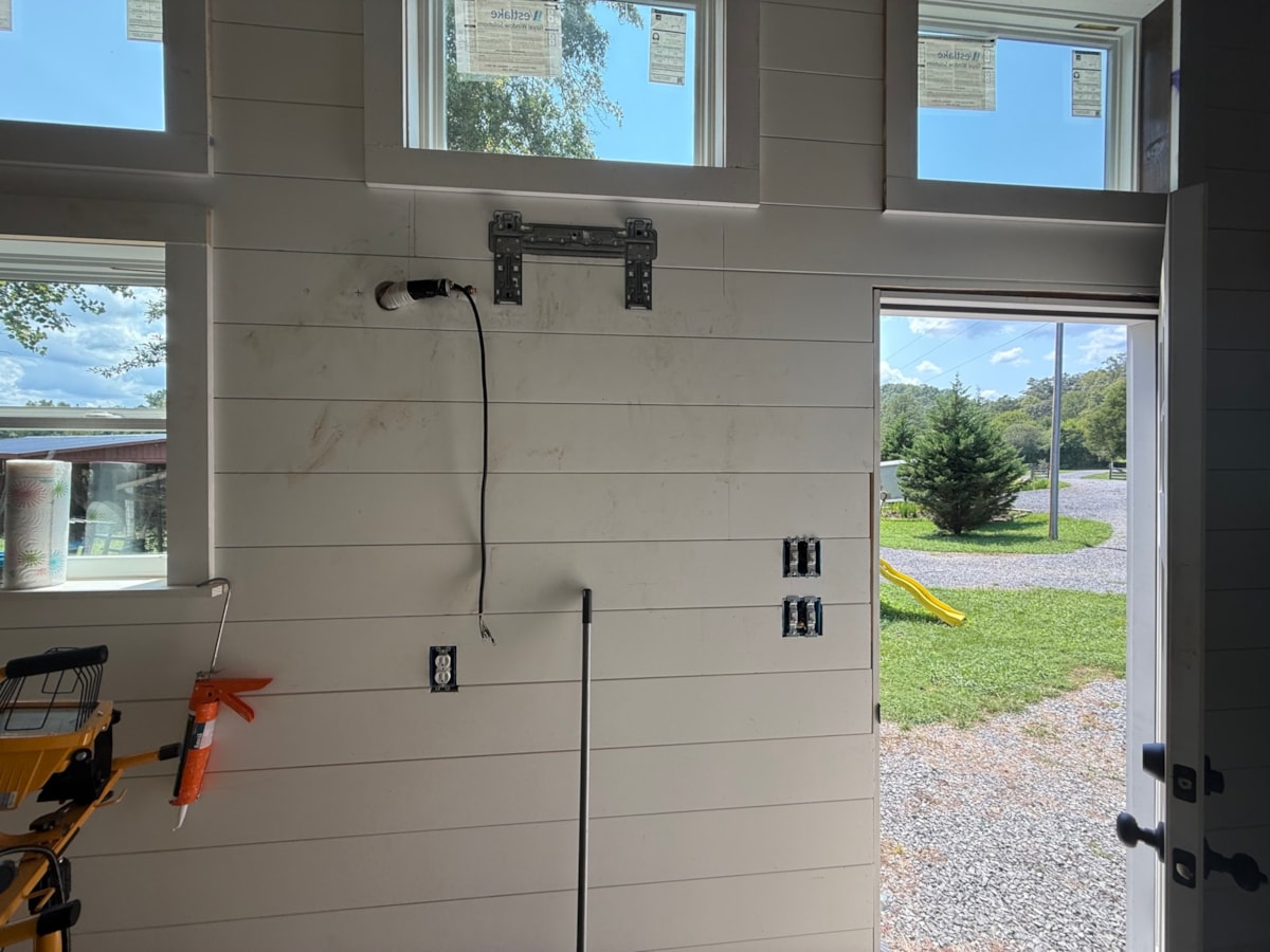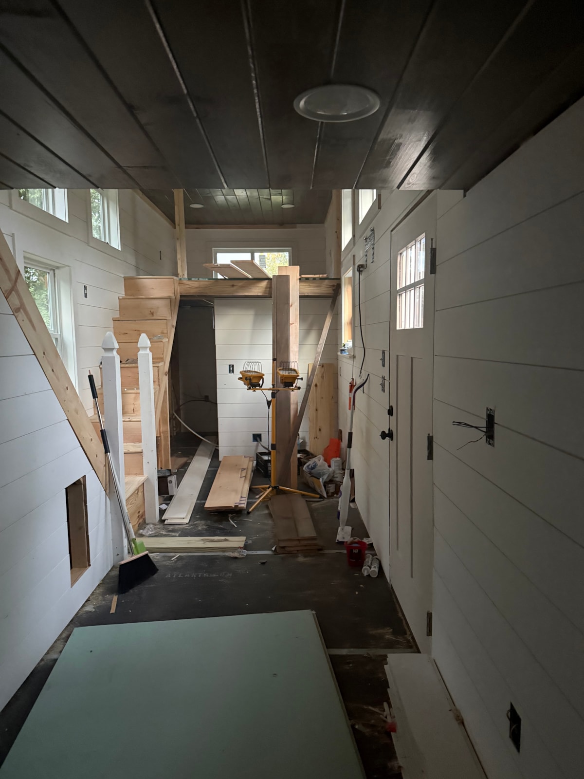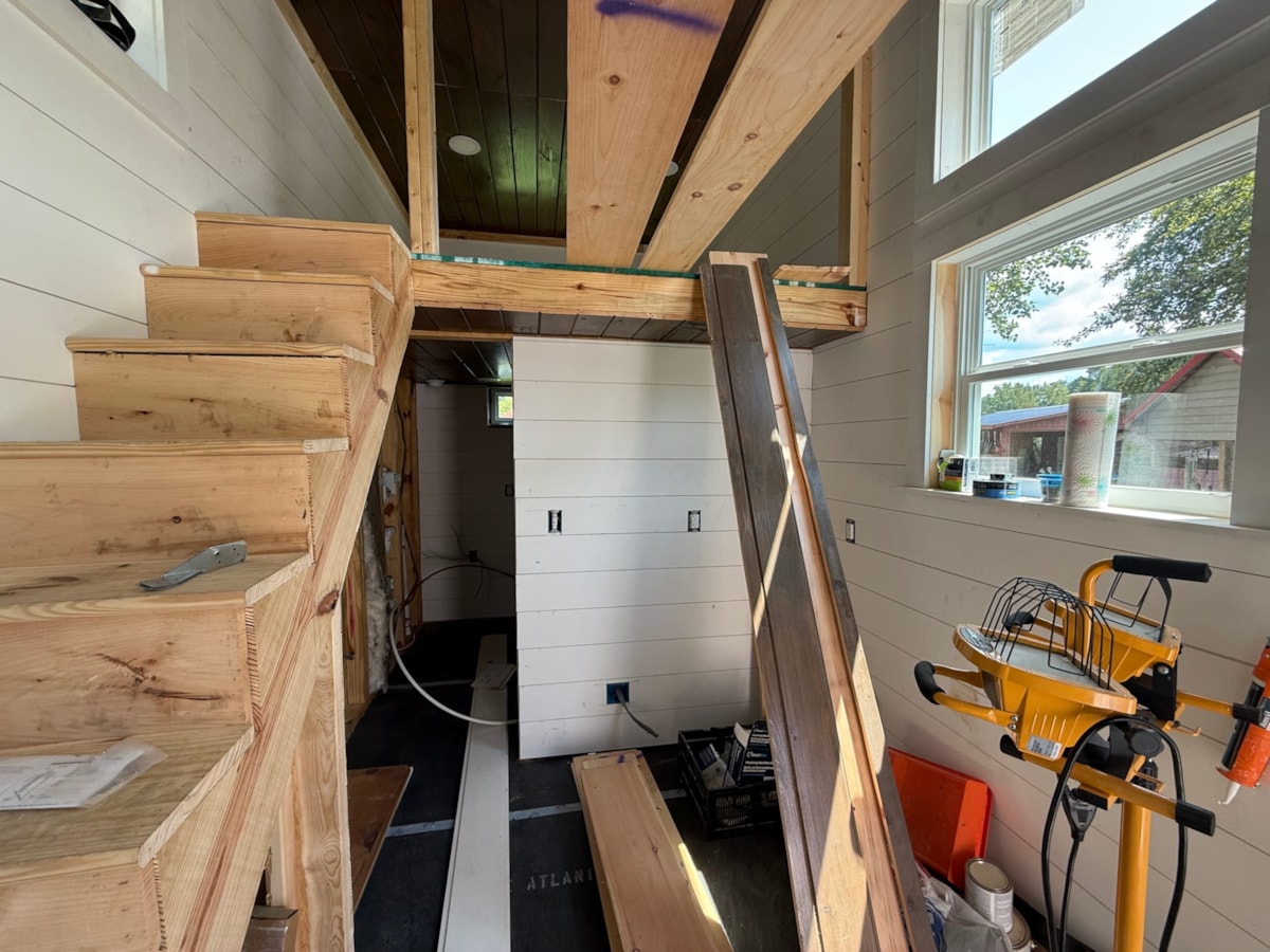 The interior still needs to be fully finished with hardwood flooring installed, cabinets hung, butcher block installed but plumbing and electrical have been done and all materials are included. The two remaining purchases are a ceiling fan for each loft and carpet for the loft areas. Beyond that, it’s ready to go.