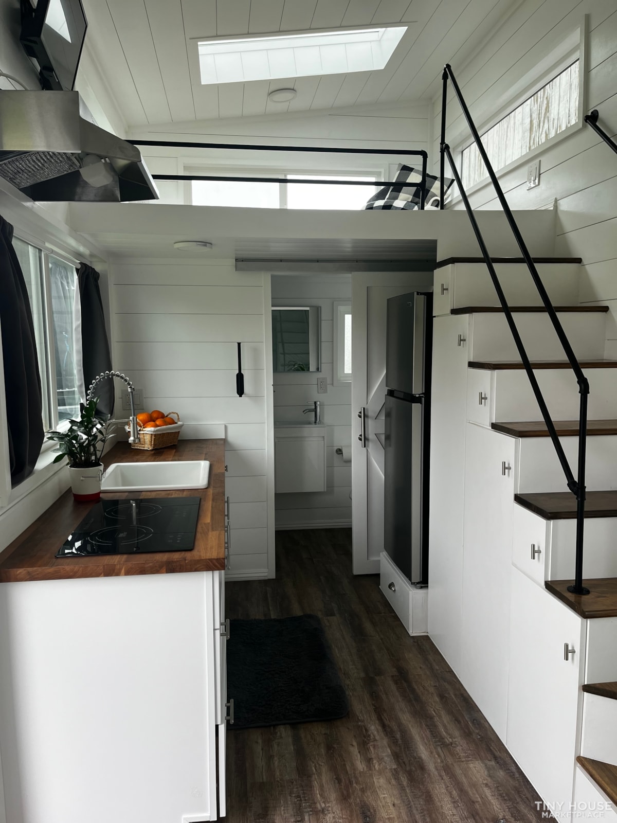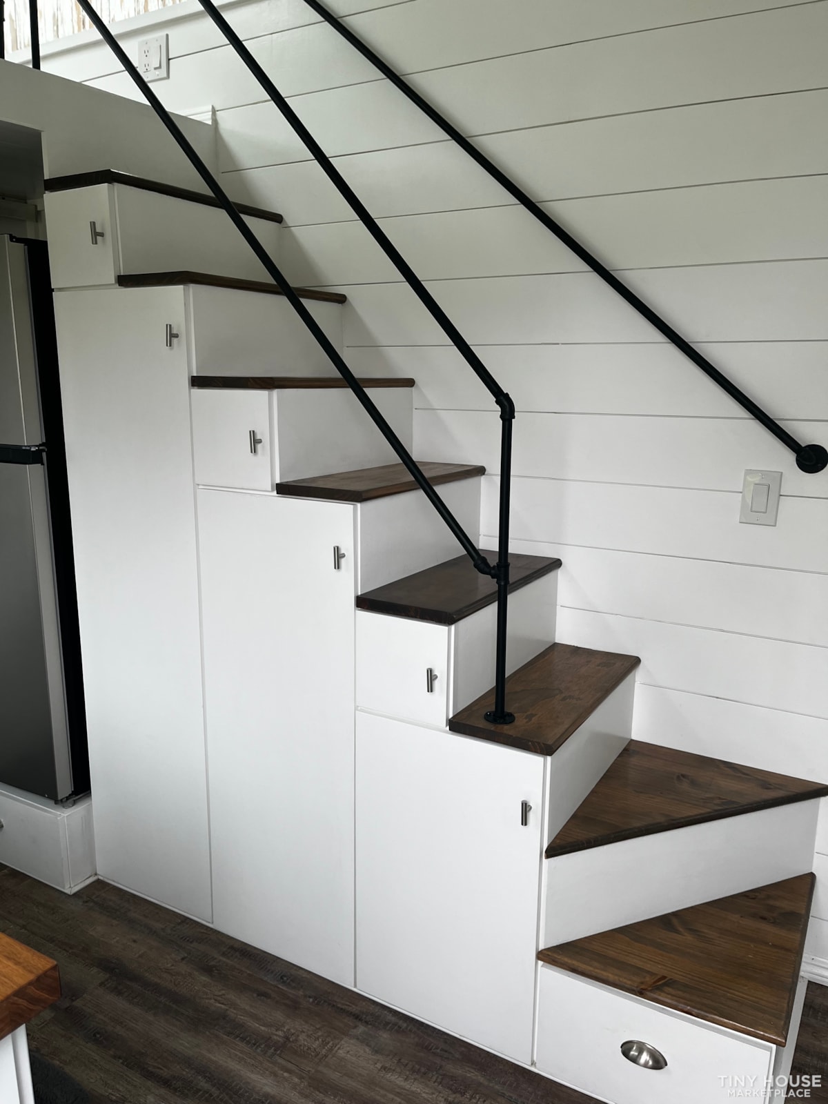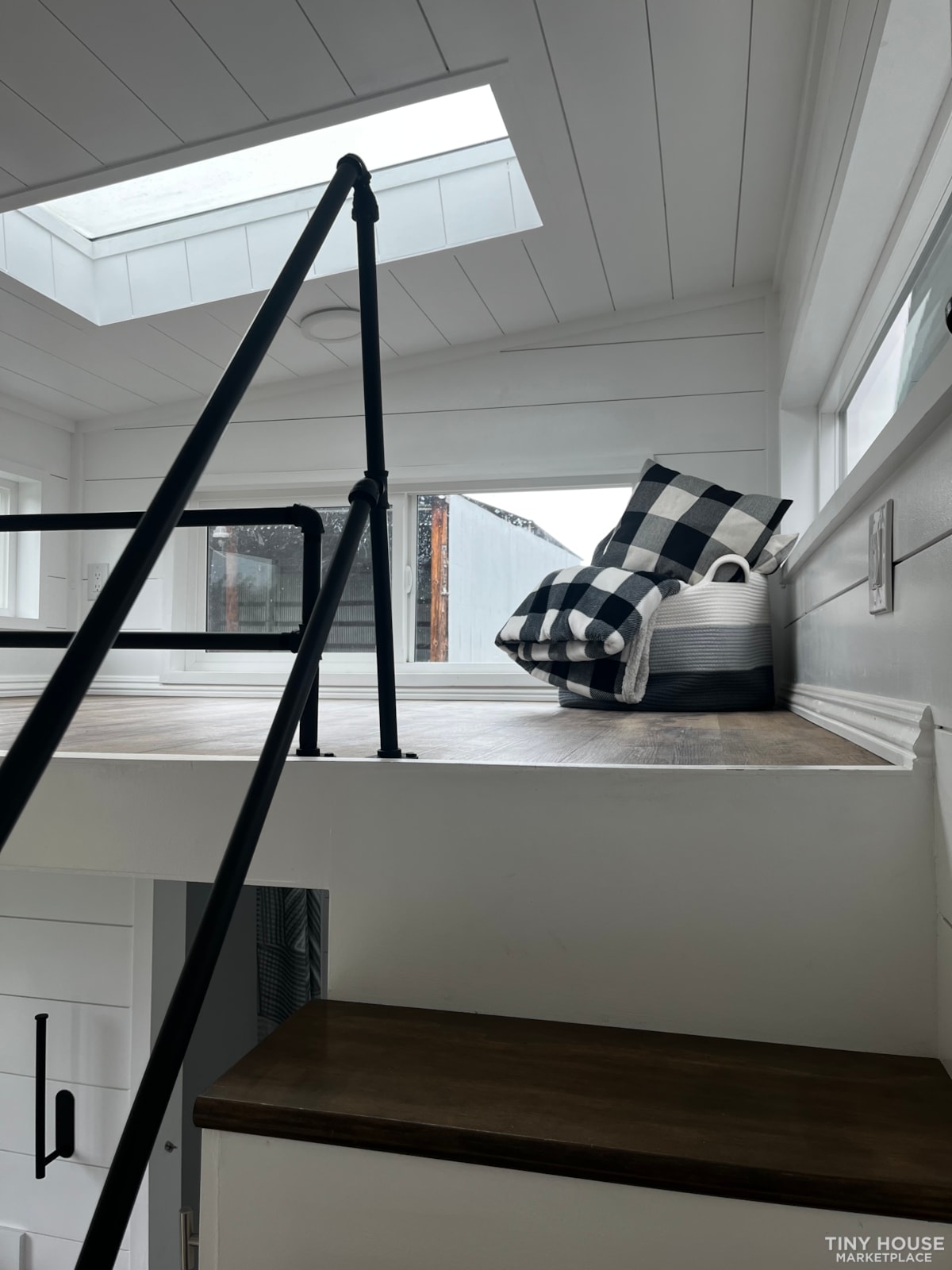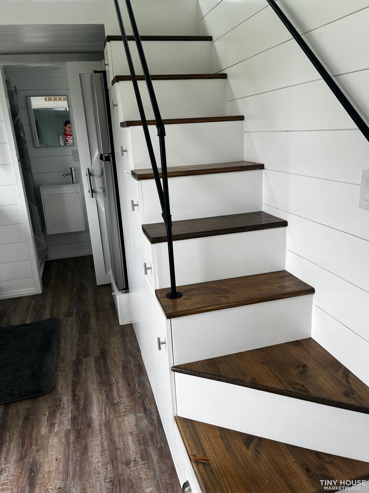 This model includes multiple upgrades: metal siding/roof, tankless water heater, solid skylight, shiplap interior, and full storage stairs leading to the loft. No damage, smoke-free, and lightly used.