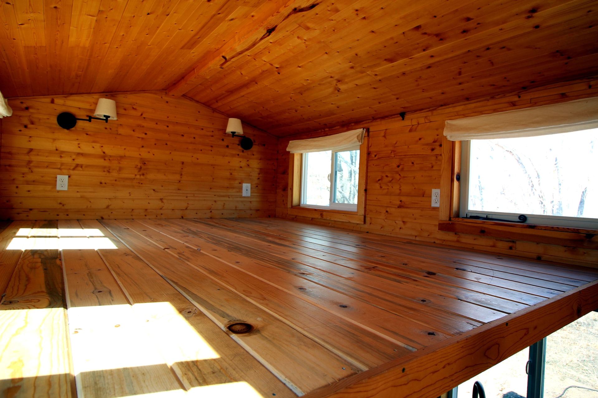 The sleeping loft is about 8’x9’ and can fit a king size bed. There is also a 4’ storage loft over the porch (not pictured).