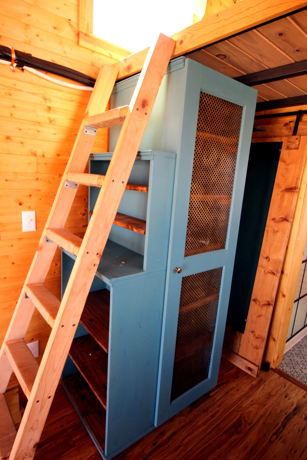 The kitchen features butcherblock countertops with a generous ceramic farm sink and pull down faucet. There is also a bespoke pantry cabinet/clothing storage cabinet with pull out shelves. The house does not come with a refrigerator but it does come with a microwave.