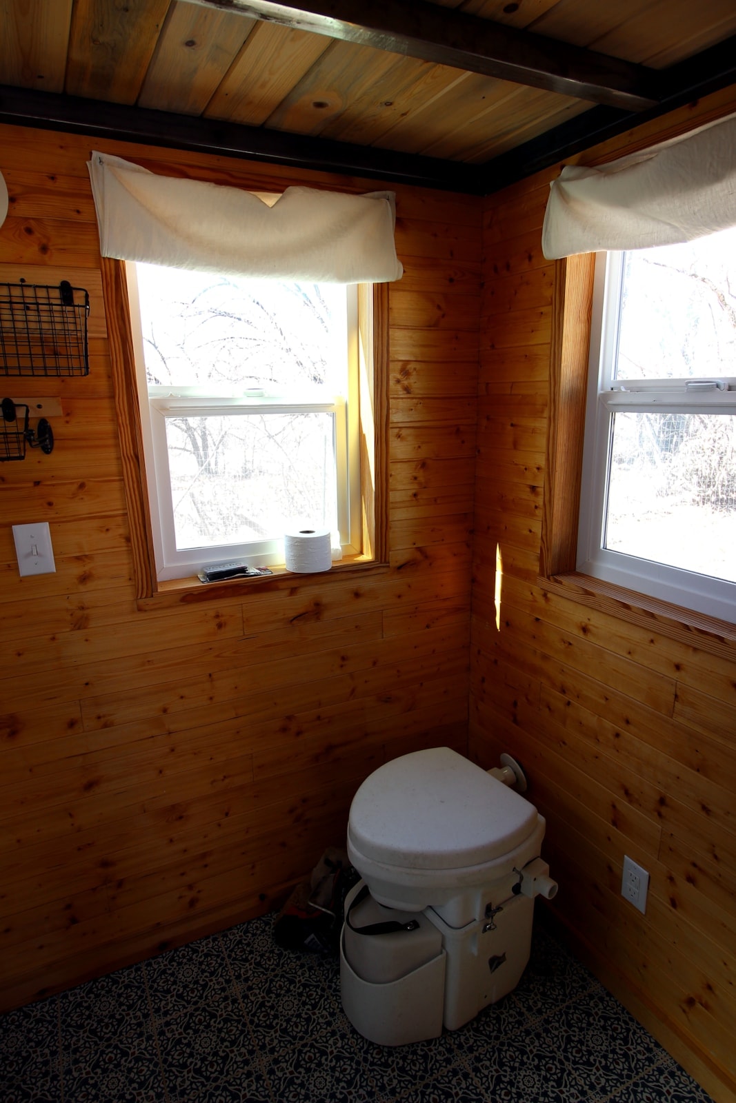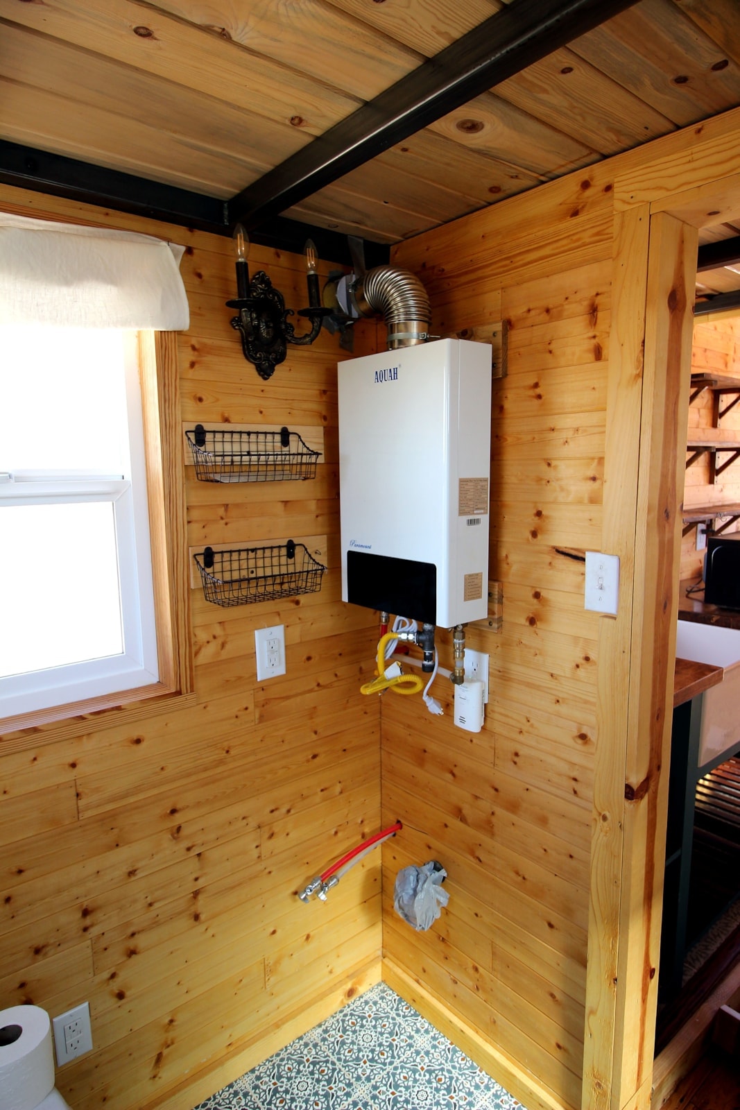 The bathroom is generous with a 5’ shower with shower wall, making it feel open and spacious. The toilet is a nature’s head composting toilet with an external fan. There is space to build in a sink or you can plumb in a laundry machine. The water heater is on demand and runs on propane.
