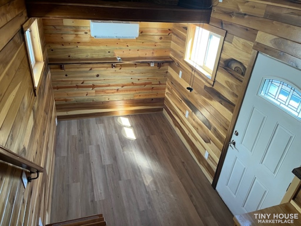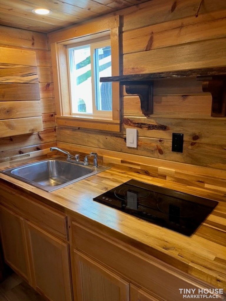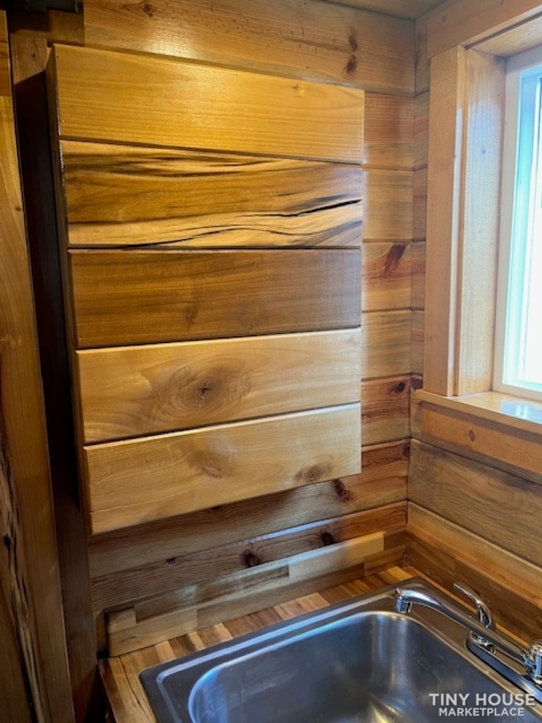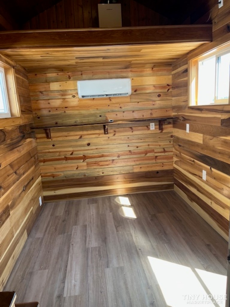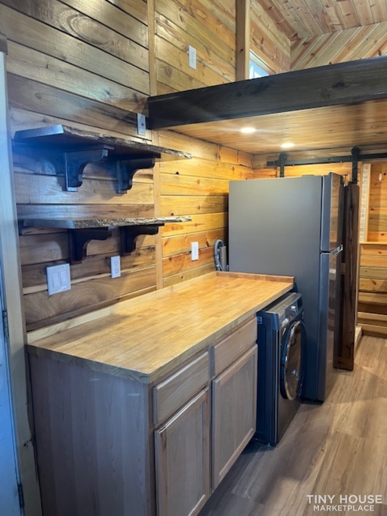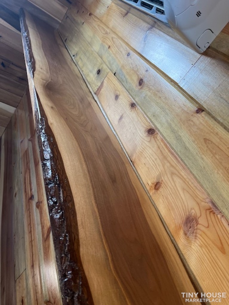 GORGEOUS woodworker's cabin tiny house on wheels. Originating in Colorado (and built for those tough Colorado winters!), it boasts beetle kill pine and poplar tongue and groove and shiplap walls. Black walnut trim details adorn the front of the storage and sleeping lofts as well as the stair treads and railing. Gorgeous live edge walnut shelves enhance the beauty and functionality of the living room and kitchen.