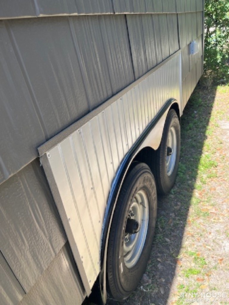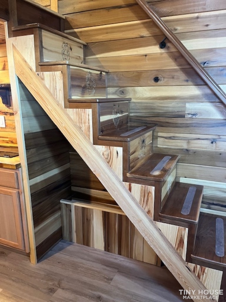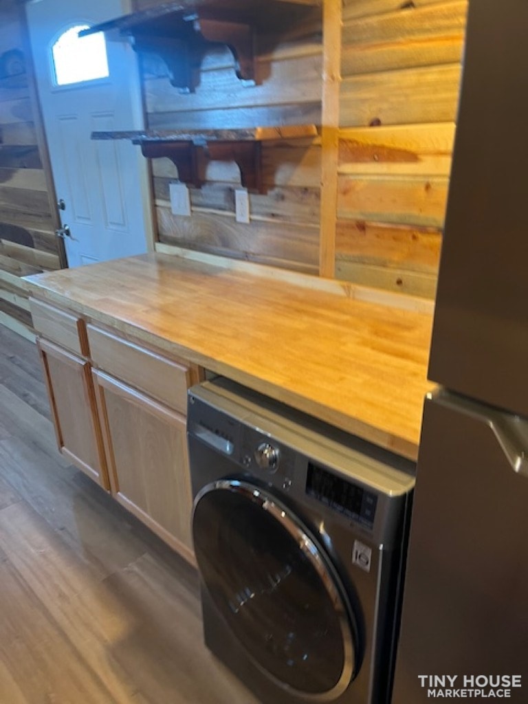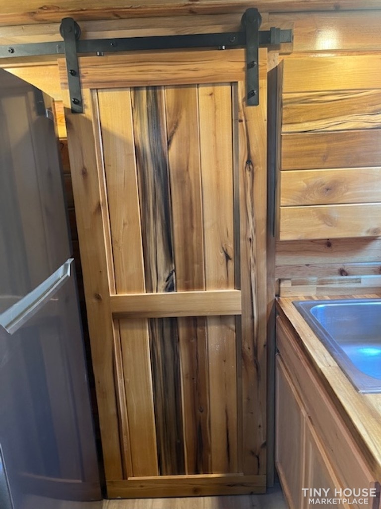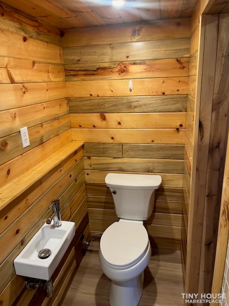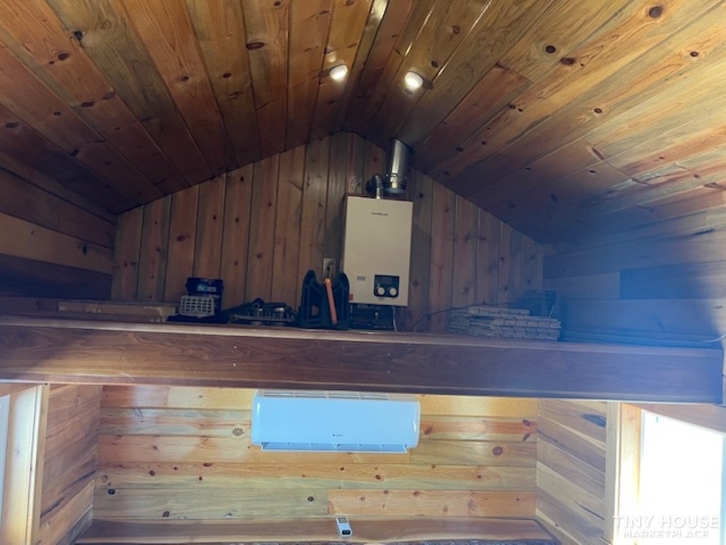 GORGEOUS woodworker's cabin tiny house on wheels. Originating in Colorado (and built for those tough Colorado winters!), it boasts beetle kill pine and poplar tongue and groove and shiplap walls. Black walnut trim details adorn the front of the storage and sleeping lofts as well as the stair treads and railing. Gorgeous live edge walnut shelves enhance the beauty and functionality of the living room and kitchen.