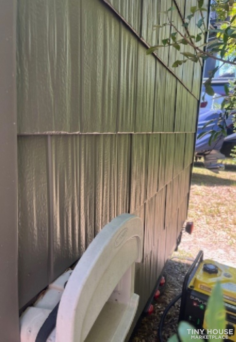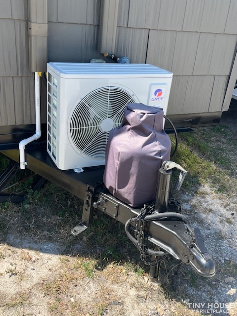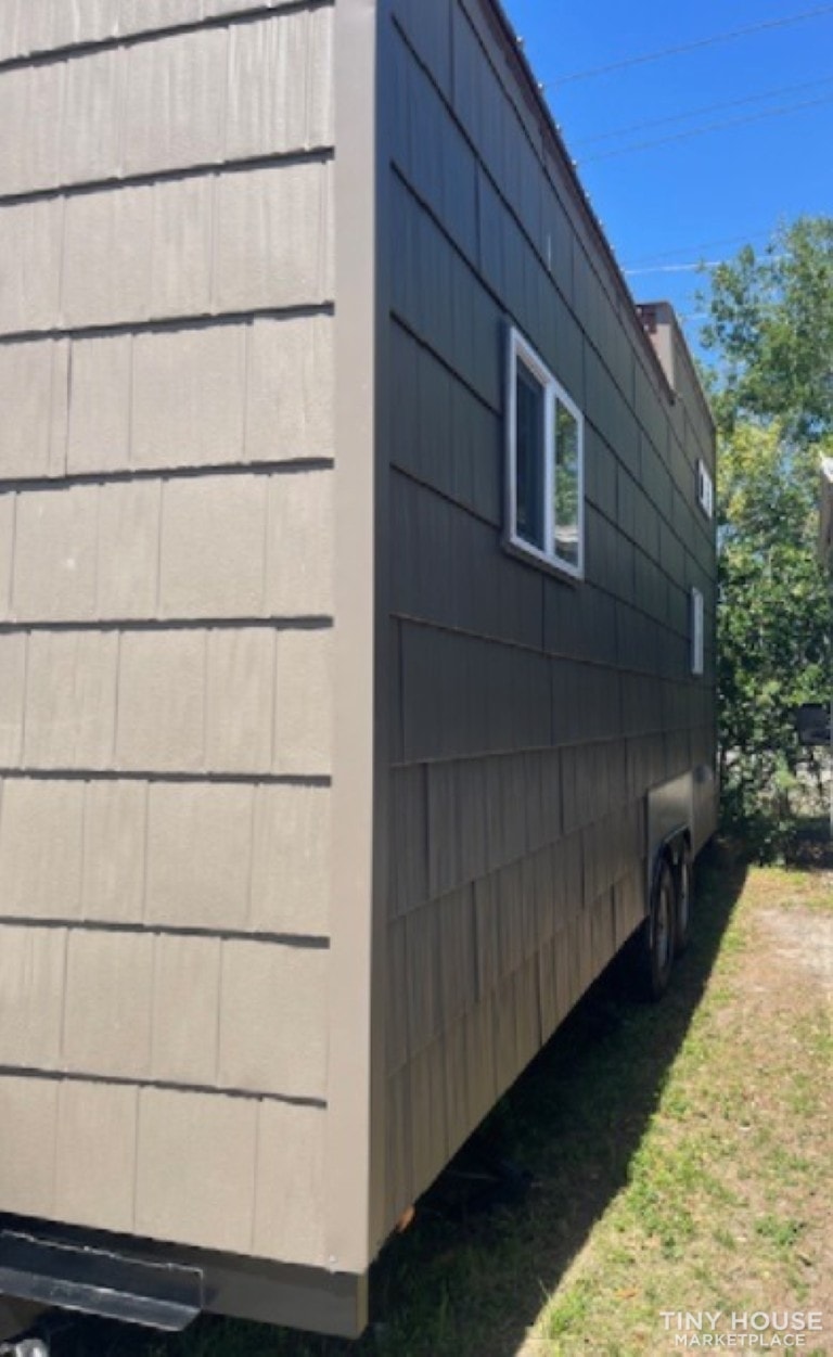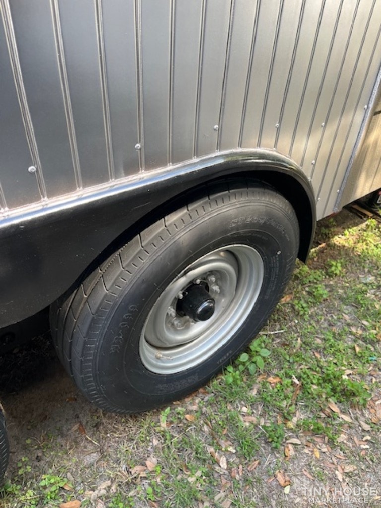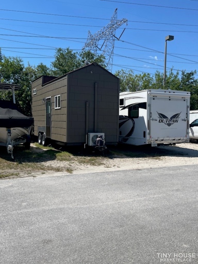 GORGEOUS woodworker's cabin tiny house on wheels. Originating in Colorado (and built for those tough Colorado winters!), it boasts beetle kill pine and poplar tongue and groove and shiplap walls. Black walnut trim details adorn the front of the storage and sleeping lofts as well as the stair treads and railing. Gorgeous live edge walnut shelves enhance the beauty and functionality of the living room and kitchen.