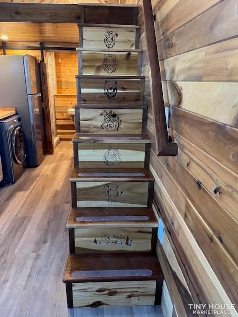 The stairs are a work of art with scroll sawn nature scenes on the stair faces and a striking and unique design on the side.