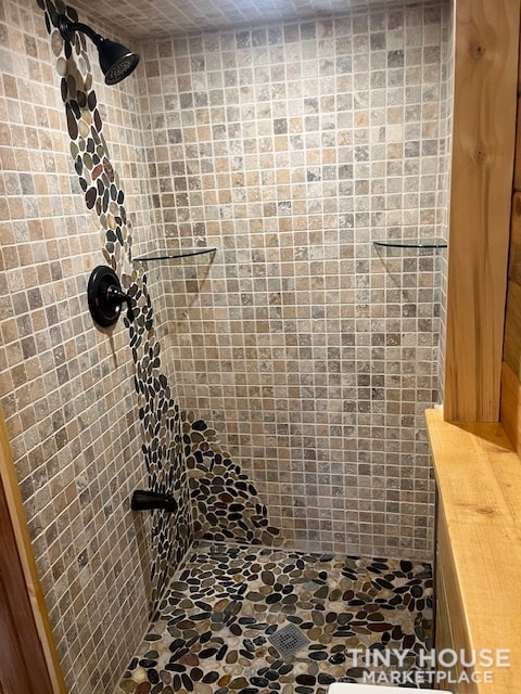 The bathroom opens with a beautiful handmade barn door and features a flush toilet, sink and spacious shower with beautiful travertine and rock waterfall tile.