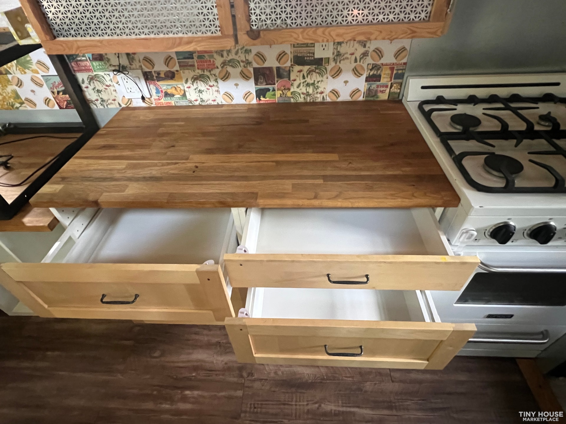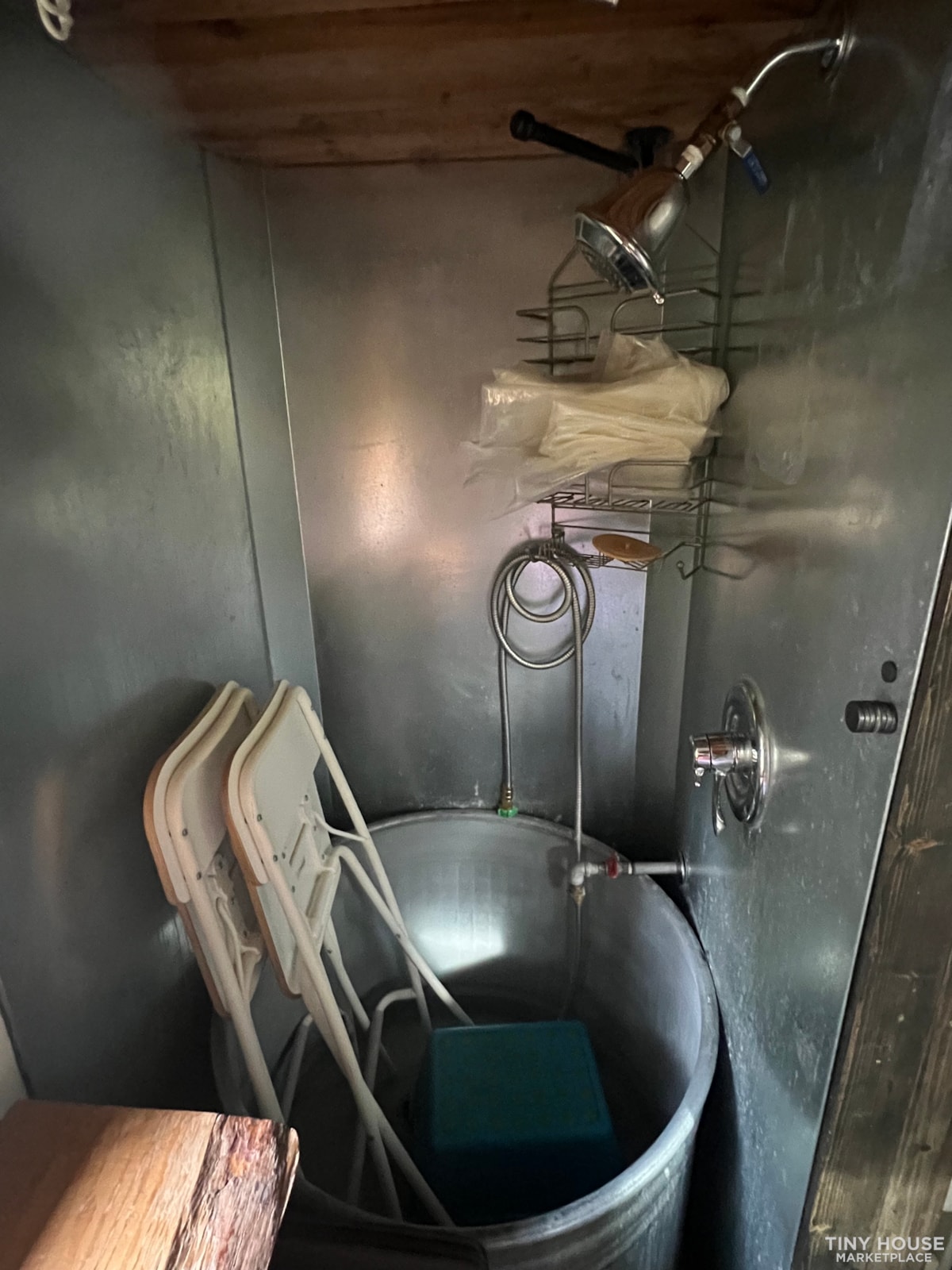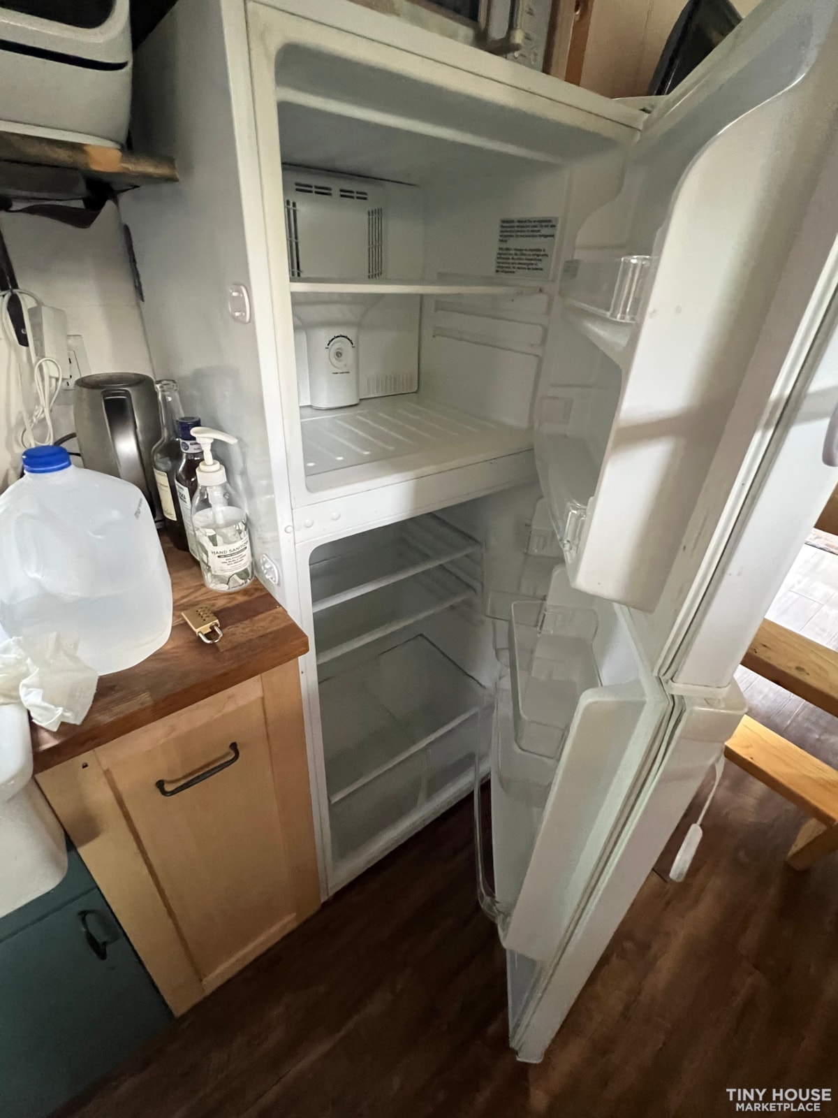 The kitchen includes butcher block countertops, live-edge shelving, a full-size propane stove and oven, mini dishwasher, refrigerator, and porcelain sink. The bathroom features a tankless hot water heater, galvanized steel soaking tub/shower combo, and semi automatic washer or space for a washer/dryer combo. There’s also an outdoor shower hookup.