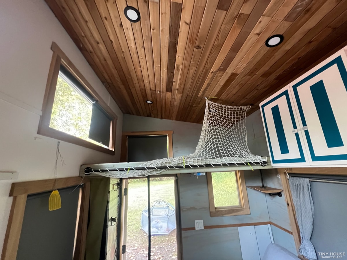 Inside, you’ll find two lofts (one about 10’, one 6’; shorter loft fits a queen bed sideways), four large wall cabinets for storage, and a bright open layout with freshly painted white walls and wood accents.