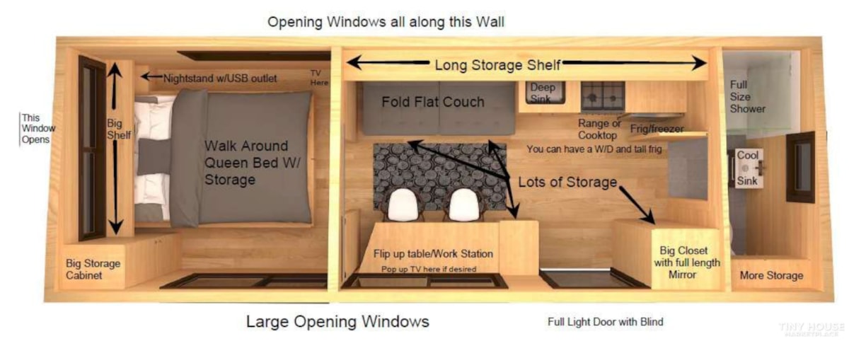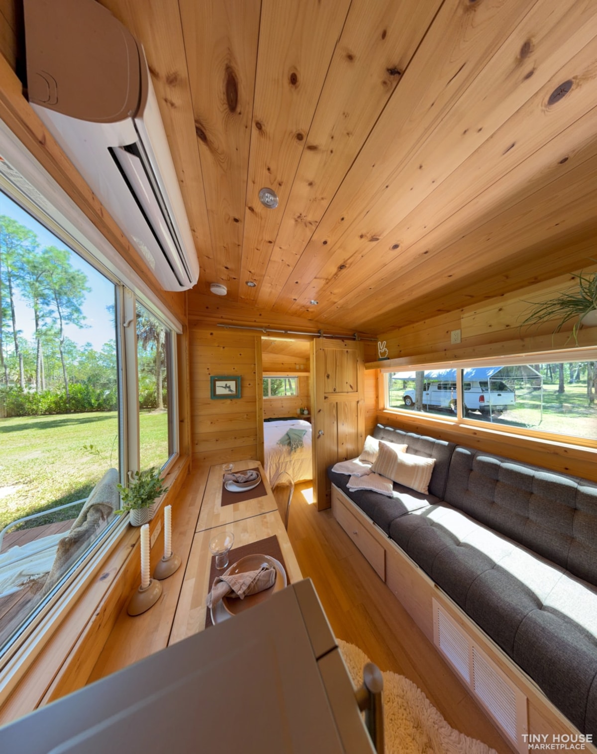 Everything is original except for factory installed upgrades at time of purchase. These include HE Split System, sliding barn (bedroom) door, custom frosted glass bathroom door, flip solid block dining table, induction cooktop (tested, never used), flawless maple cabinets, butcher block countertops, XL bedroom windows, and more. It still smells of newly installed wood!