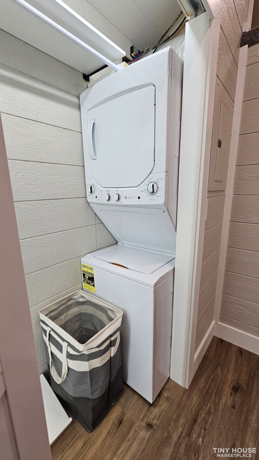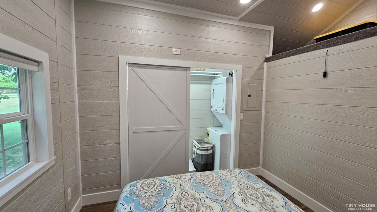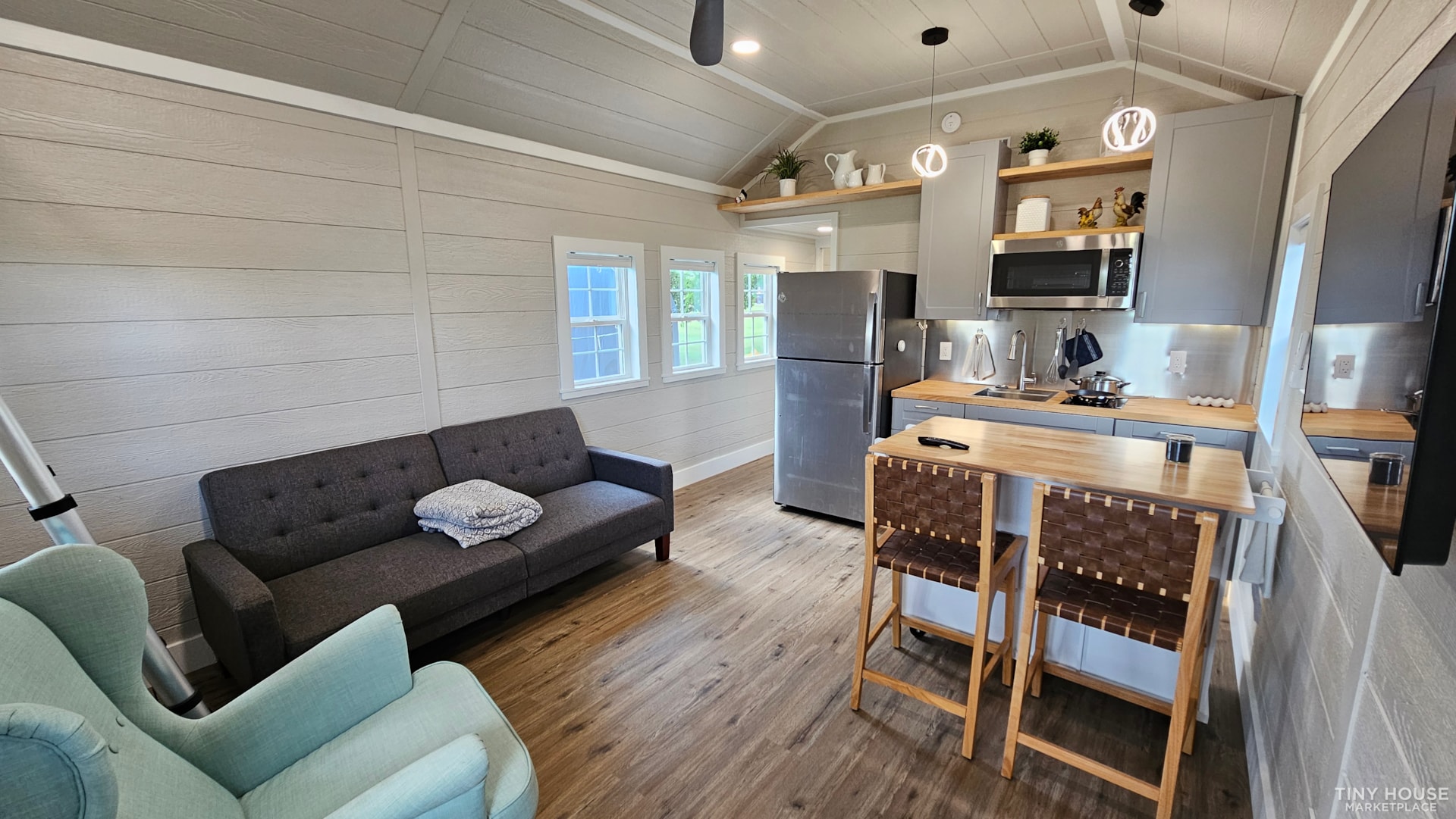 Step into a tiny home that proves small can still mean spacious, comfortable, and secure. Designed with modern living in mind, this home includes all the essentials you’d expect in a traditional house: a washer and dryer combo, full-size refrigerator, electric stove, convection oven, and even a dishwasher.