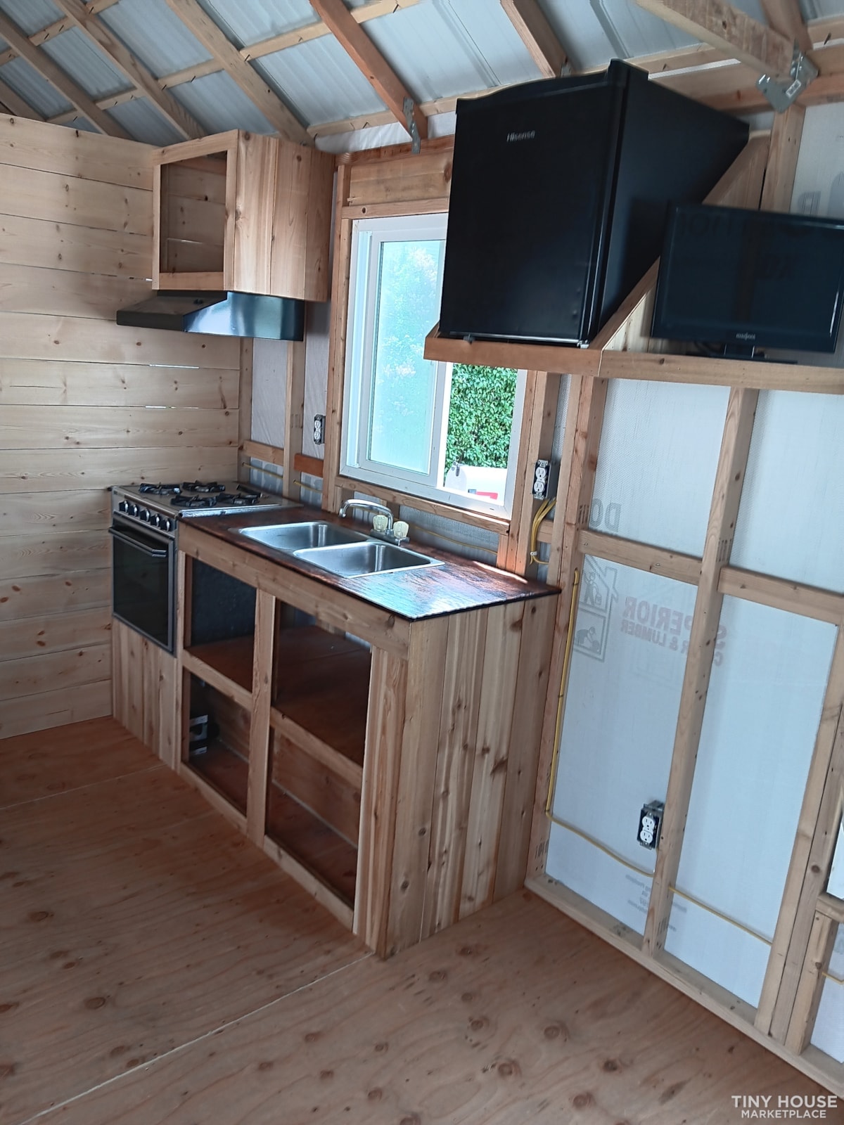 A spacious kitchenette area innovated into the open floor plan keeps this home feeling wide open although a bedroom divider wall can be easily added if wanted. The kitchenette comes as seen in pictures with a 4 burner lp gas stove oven combo, nice matching stove range hood, and nice double tub kitchen sink. And also a nice little breakfast nook to look out to the beautiful nature.