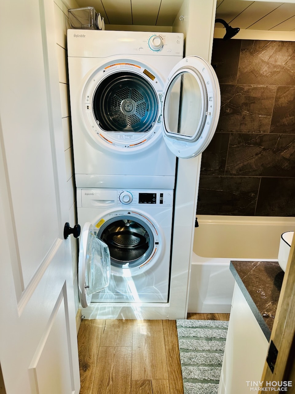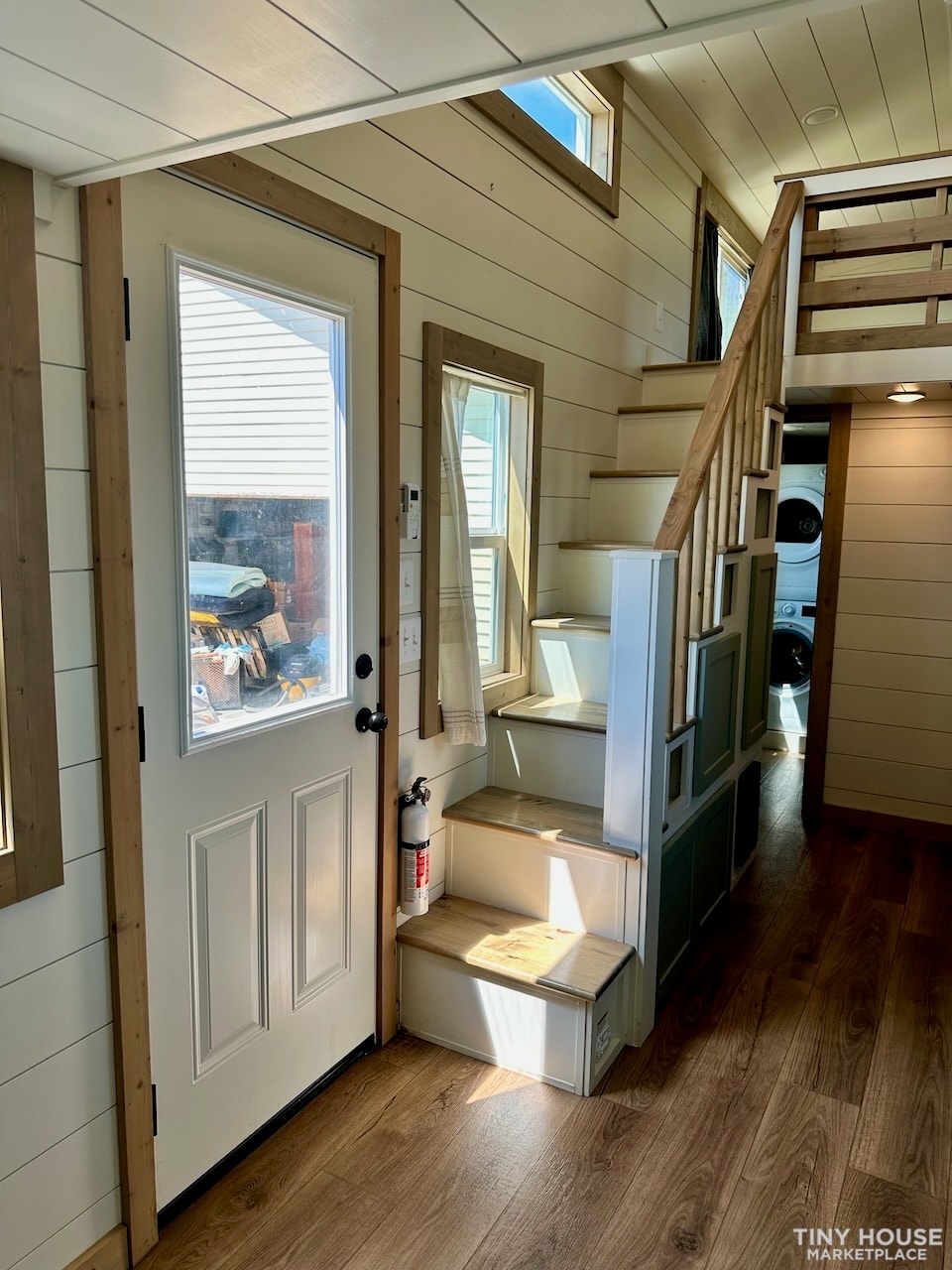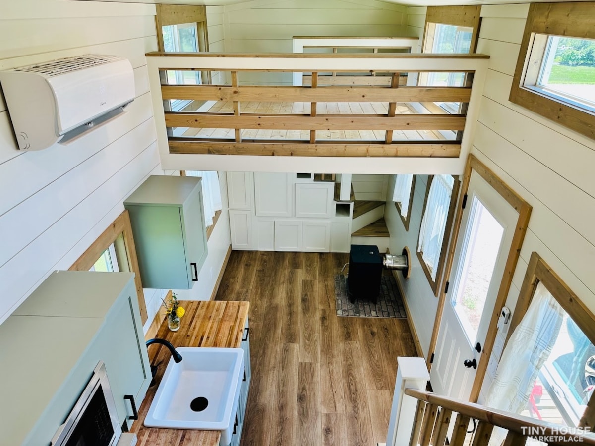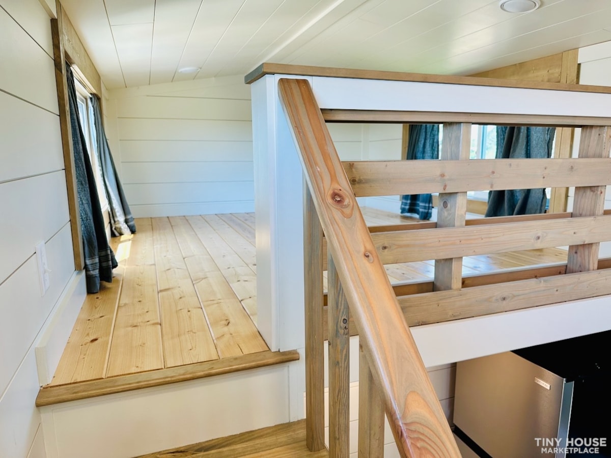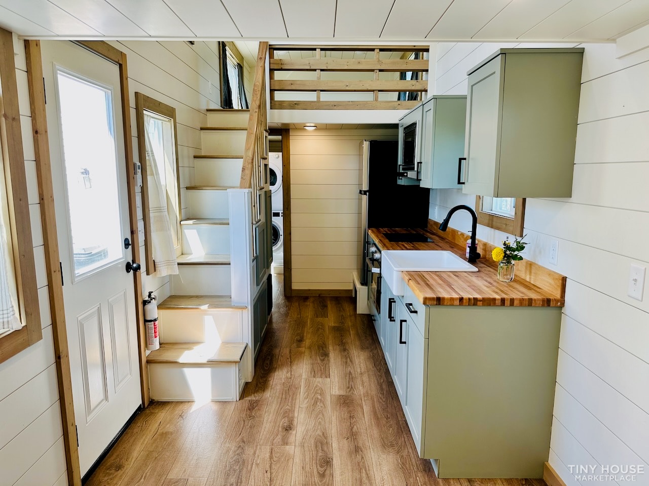 Features include two bedroom lofts with separate staircases, full bath (with flush toilet, hookup for composting toilet available), stacked washer/dryer, mini split, Rinnai propane on-demand hot water heater (RE140iP model; 10,400 BTU minimum), full kitchen with induction cooktop and convection oven, and lots of natural light.