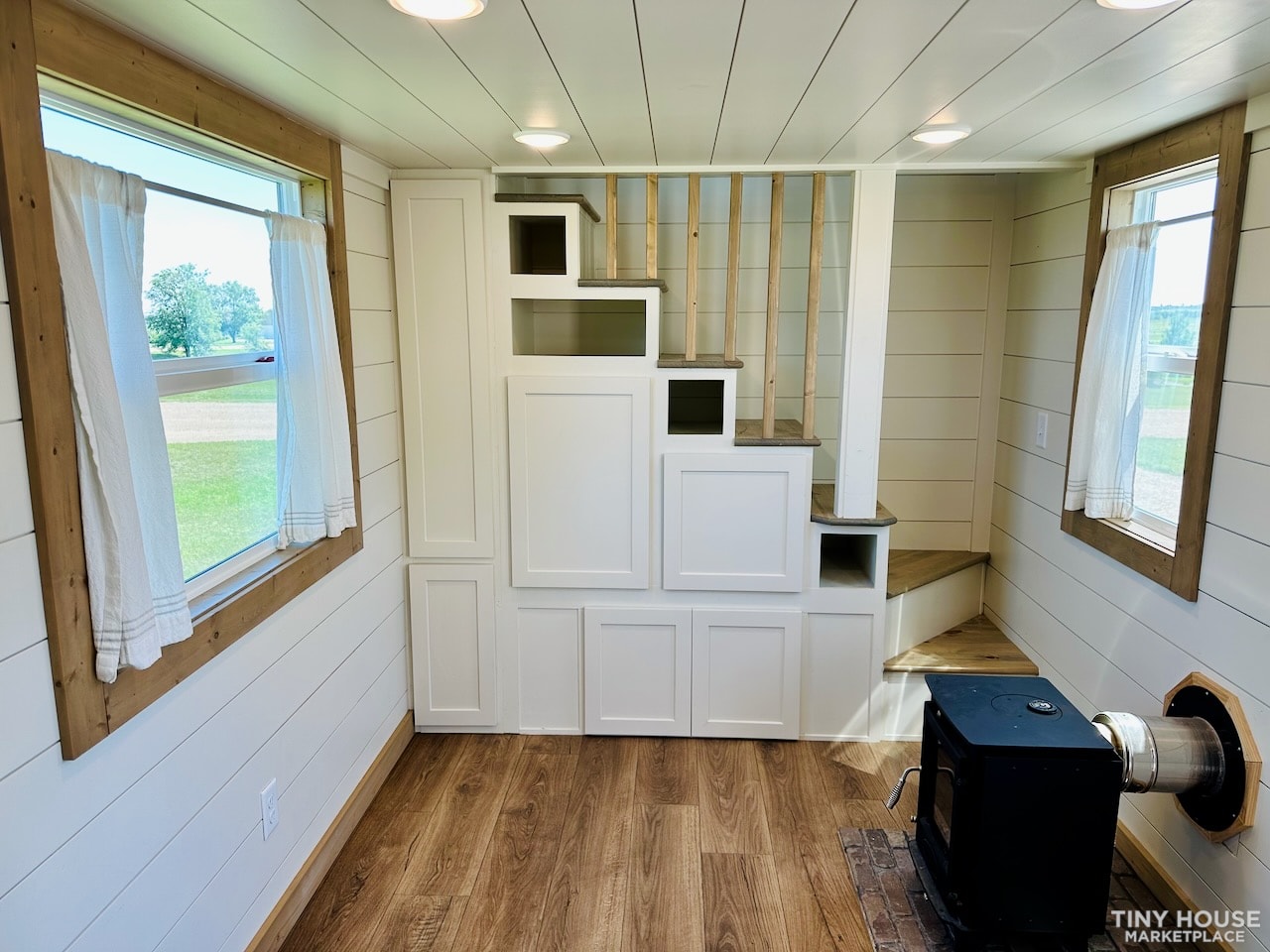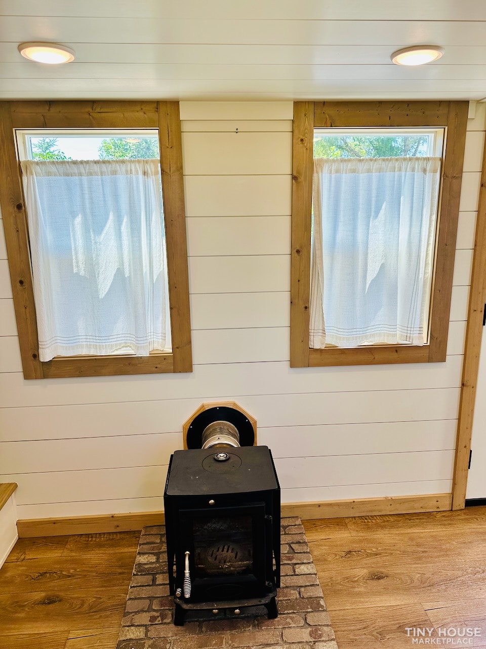 Indoor hot water heater, Dwarf 5kW wood stove on a Hebron Brick hearth and spray foam insulation means this tiny house has been upgraded for a North Dakota winter! Perfect for a lake cabin or in-law suite.
