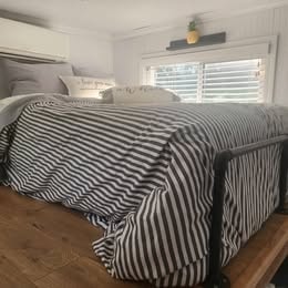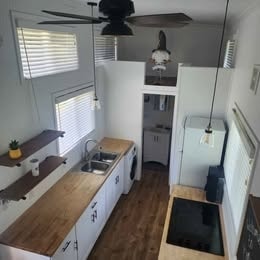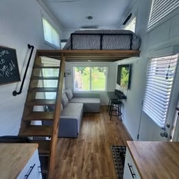 This farmhouse architectural masterpiece boasts metal roofing, dual pane windows, mini split heating/AC, washer/dryer, fridge/freezer and 4 burners cooktop. This home features butcherblock countertops and a refrigerator. The tiny home is made from high-quality materials built on tandem axle metal trailer. With one bedroom and one bathroom and a 2nd loft for guest or storage, this tiny house is perfect for those who want to live simply yet comfortably. The lofts are roomy with plenty of head space. Spacious bathroom 3x 8ft with tub/shower. With 11 double pane windows with screens and blinds to allowed plenty of daylight. The living room area comes with a Sleeper sectional,3 seat w/storage, turn into double bed for more guests. A fold down table with 2 seats to eat comfortably. Farmhouse pendants lights and a ceiling fan.