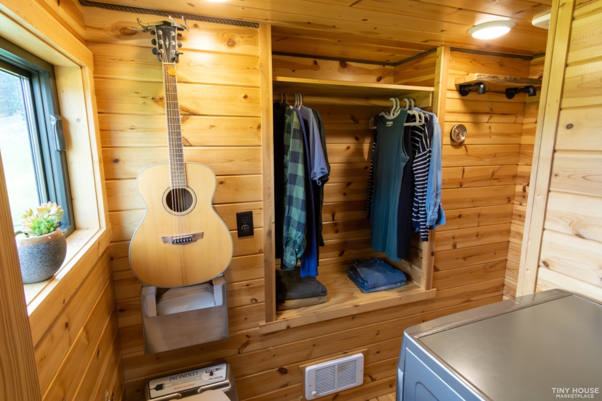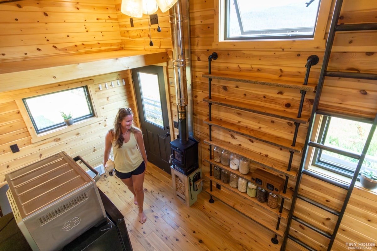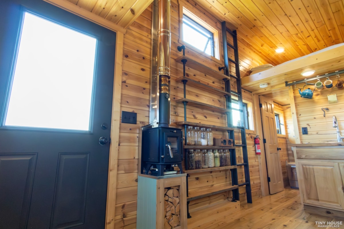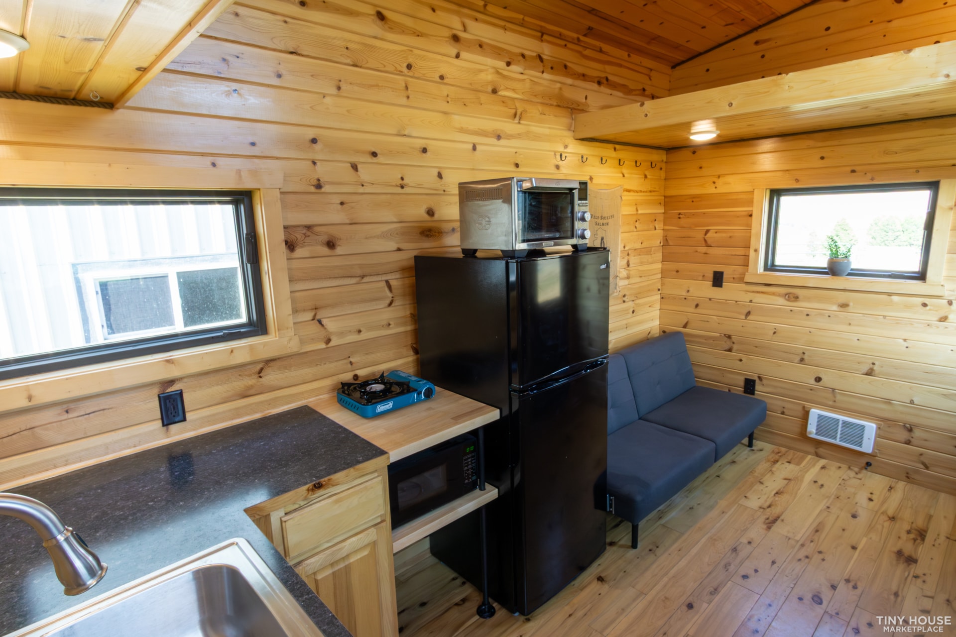 Layout: Two lofts (one fits king bed with closet, one fits twin/storage), tongue-and-groove interior, high ceilings, hardwood floors, plenty of windows.